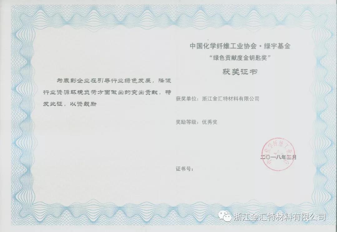 为加快构建科技含量高、资源消耗低和环境污染少的化纤行业绿色制造体系,深入结合《中国制造2025》和《工业绿色发展规划(2016-2020)》等政策导向指引下,我公司基于企业实际情况,从科研领域、生产过程、产品领域和环境领域五个维度探索绿色化生产路线,在引导行业绿色发展,降低行业资源环境负荷方面做出了突出贡献,荣获2018年中国化学纤维工业协会·绿宇基金“绿色贡献度金钥匙奖”优秀奖。
