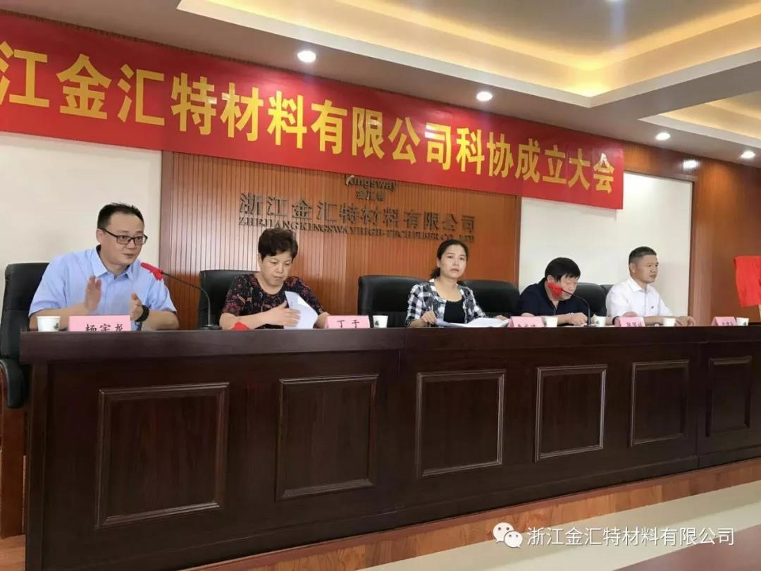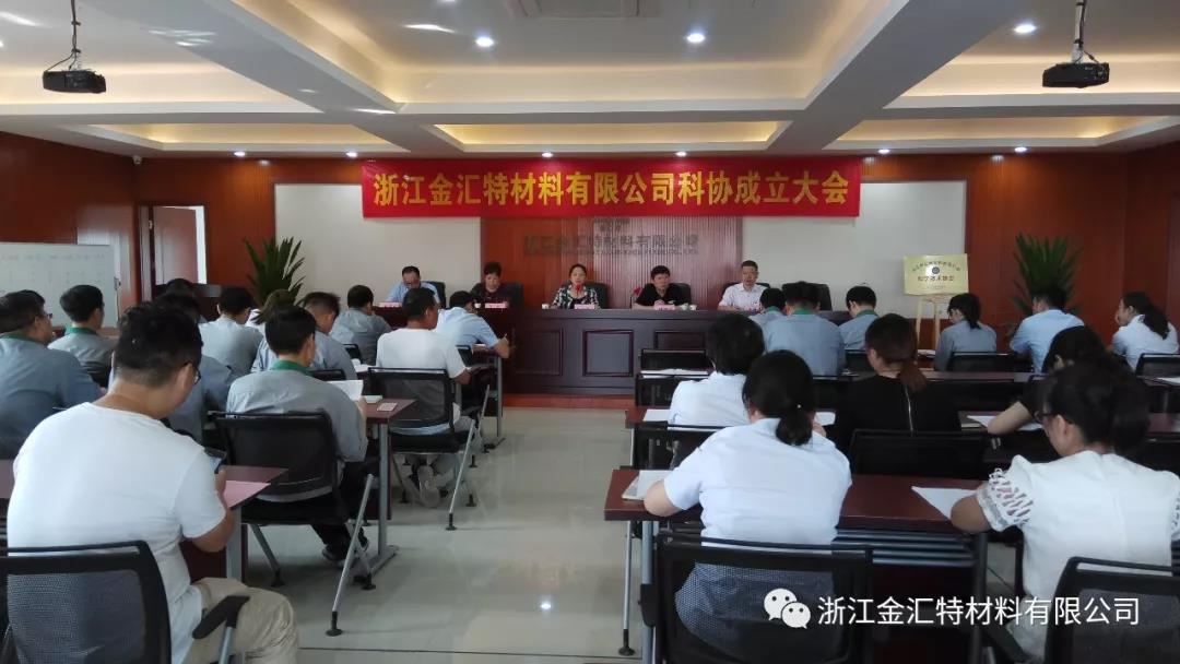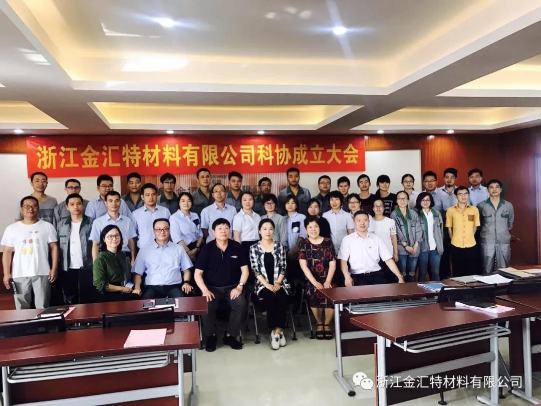 2018年9月25日下午,浙江金汇特材料有限公司行政楼五楼多媒体会议室召开了公司科协成立大会,公司董事长陈国祥、总经理陈燕、常务副总杨宇龙等公司领导及科协会员计39人出席了会议,丁桥镇党委副书记及科协主席朱水建、镇经发办副主任丁于、镇科协秘书长沈建庆3人到会指导。