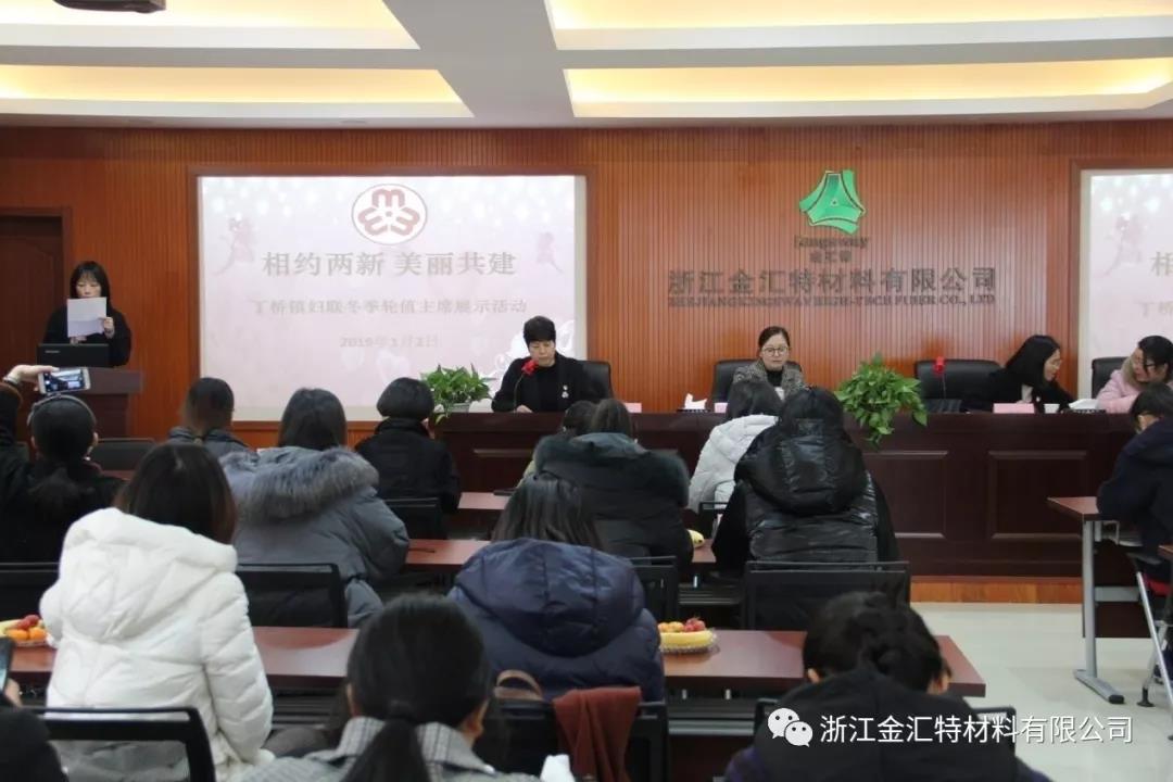 继浙江金汇特材料有限公司第一次妇女代表大会召开以来,2019年1月2日公司妇女联合会作为丁桥镇妇联冬季轮值主席团的执委,承办了以“相约两新,美丽共建”为主题的丁桥镇妇联展示活动。活动由丁桥镇妇联、各村社区妇联、新建企业妇联主席共33人参加。公司总经理兼妇联主席陈燕携公司妇联会成员一行5人参加了活动。