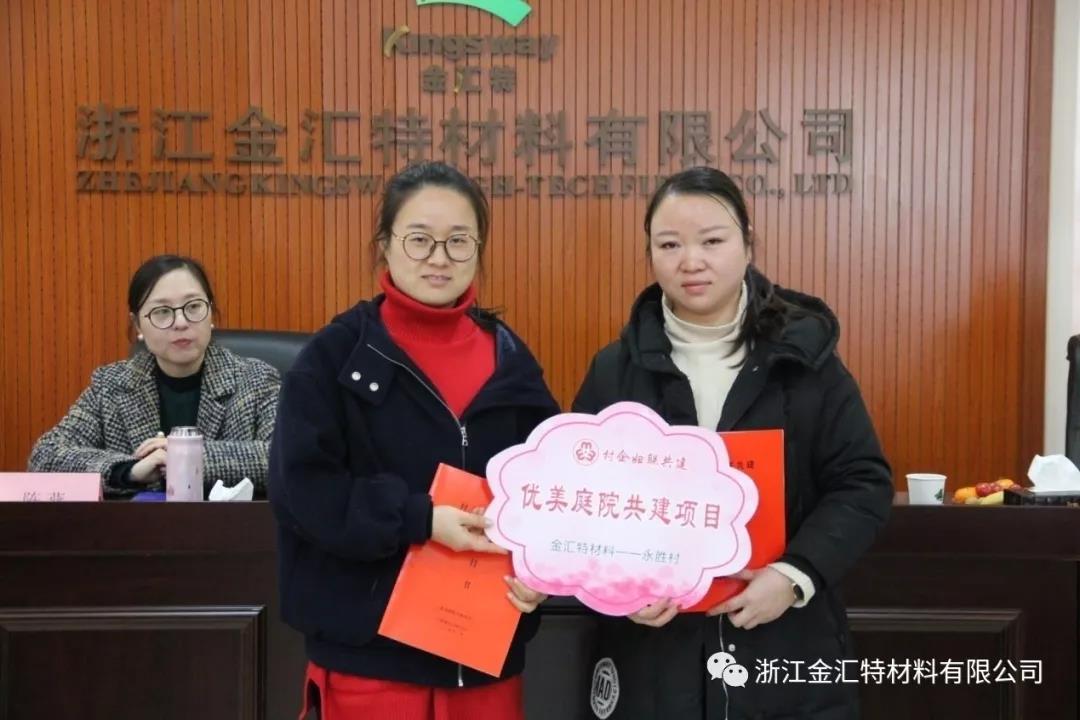 会上,丁桥镇妇联对新成立的8家妇女联合会企业进行了授牌,浙江金汇特材料有限公司妇女联合会派代表上台领牌。同时开展了村企妇联9个共建项目的结对签约,浙江金汇特材料有限公司妇女联合会陈云代表公司妇联与永胜村结对签约《优美庭院共建项目》。丁桥镇妇联主席顾权代表政府见证村企结对项目的签约仪式并作重要讲话,要求各村企妇女联合会应以妇联轮值展示活动为契机,抓思想、抓帮扶,用匠心精心,创新思维做好妇女工作,为丁桥镇妇女工作上新的台阶献计献策尽绵薄之力。