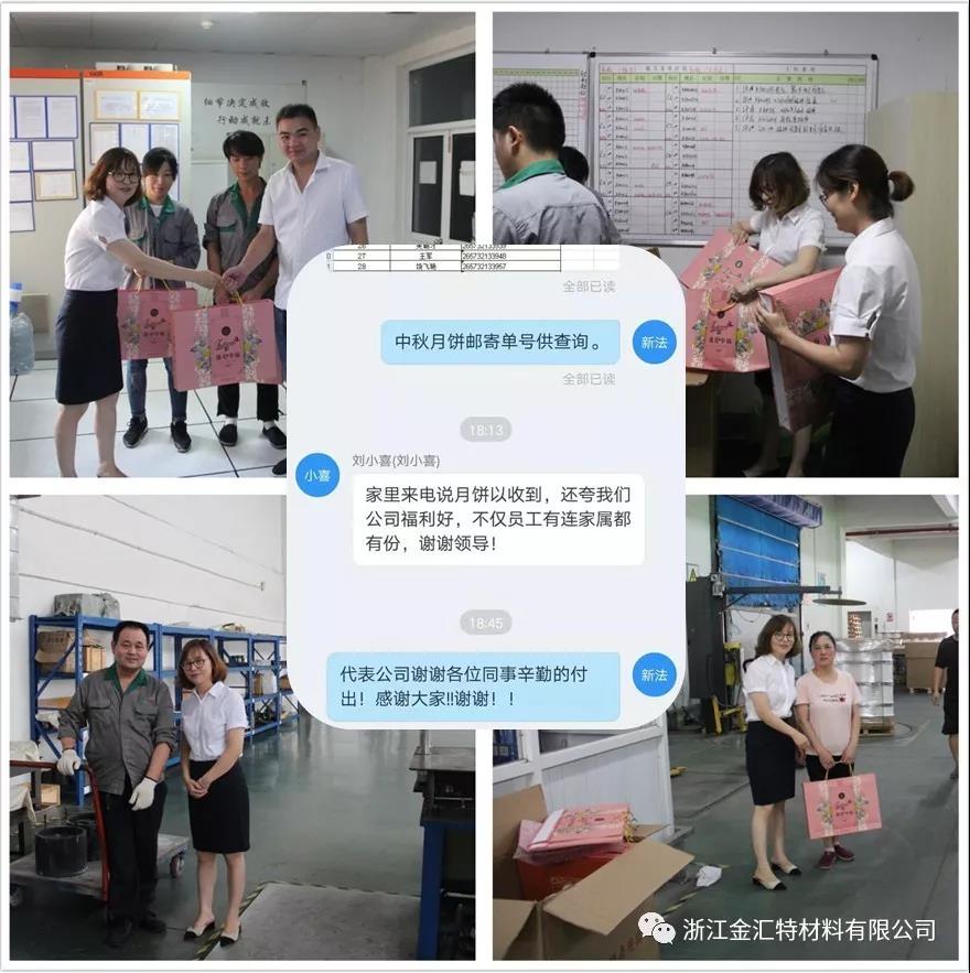 9月9日上午,金汇特公司员工刘小喜,接到了在广西家人的电话。电话那头,家人高兴的告诉他:“公司寄来的月饼收到了,连夸公司福利好!跟公司领导道一声谢啊,让他们费心了!”这几天,和刘小喜一样,公司的许多员工都收到了来自家人的电话和短信。