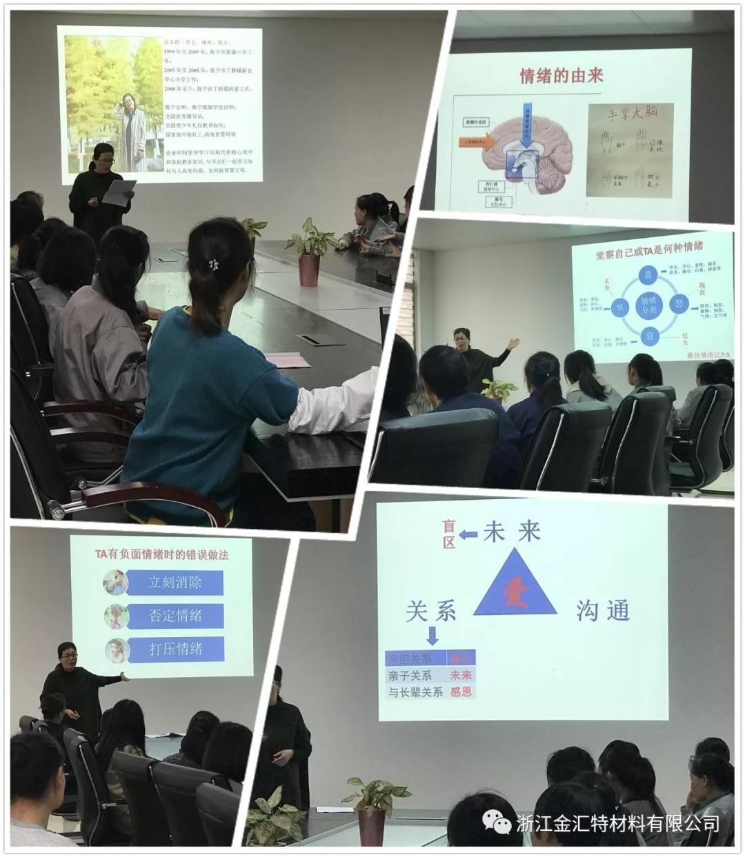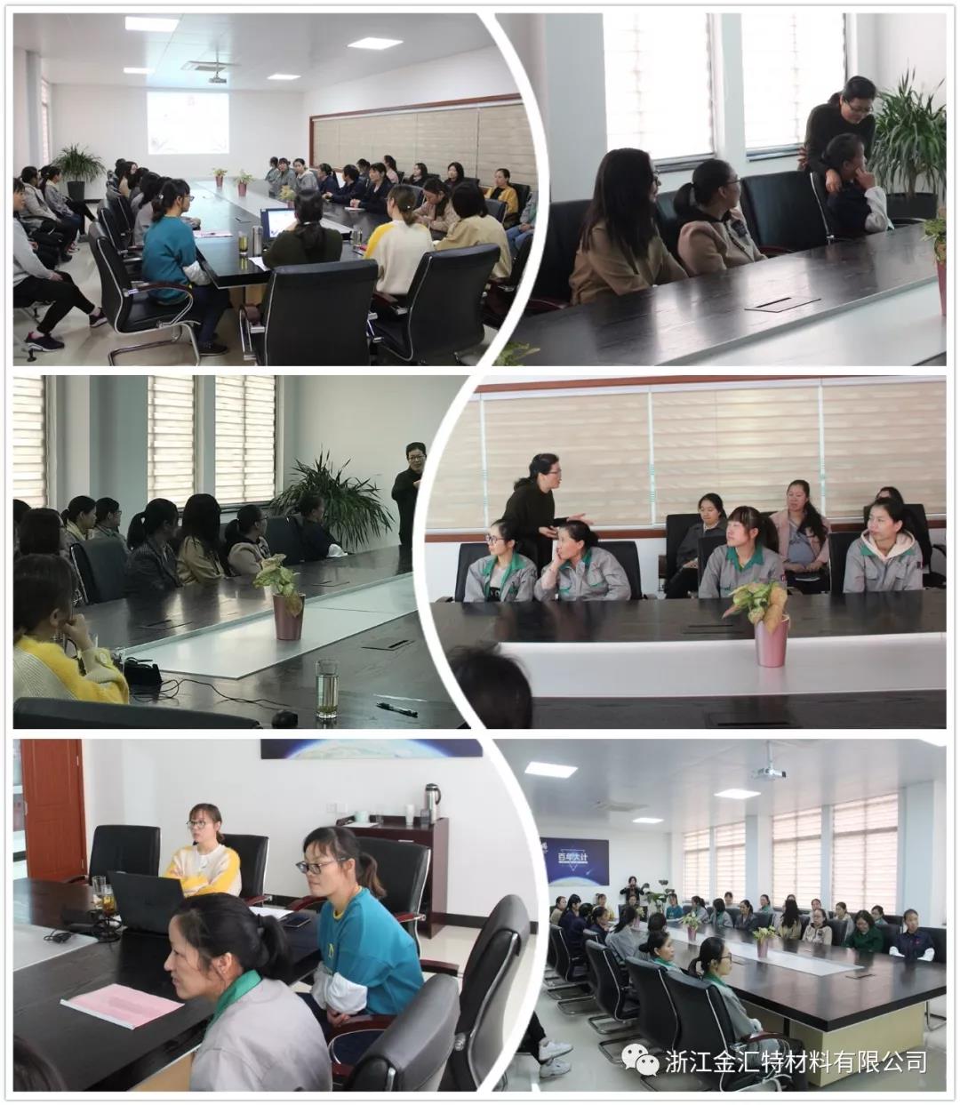 良好的心理素质与我们的健康、工作学习、人生幸福等都有着十分密切的关系,为了帮助大家激活内在动力,在工作中提升团队的凝聚力,在家庭中创造更多的幸福与快乐,2019年11月22日下午,浙江金汇特材料有限公司妇联组织女职工30余人参加了“姐妹学堂”进两新组织公益活动《打造家庭爱的能量场一一情绪管理》 专题讲座。此次讲座邀请了海宁名师、海宁姐妹学堂讲师、全国优秀辅导员、全国青少年礼仪教育标兵宓东群讲师。丁桥镇妇联顾权主席到会并参与了讲座。